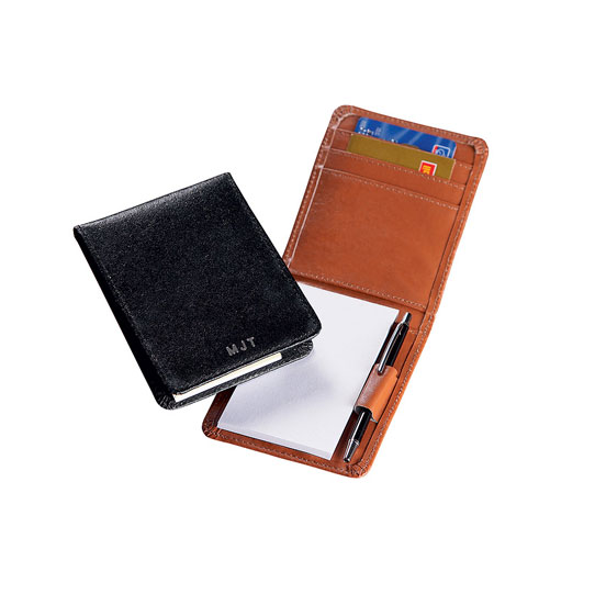 This leather junior padfolio features a laser engraved and ramhead design in black. Contains a notepad, folder flap, pen holder and business card holder on the inside.
