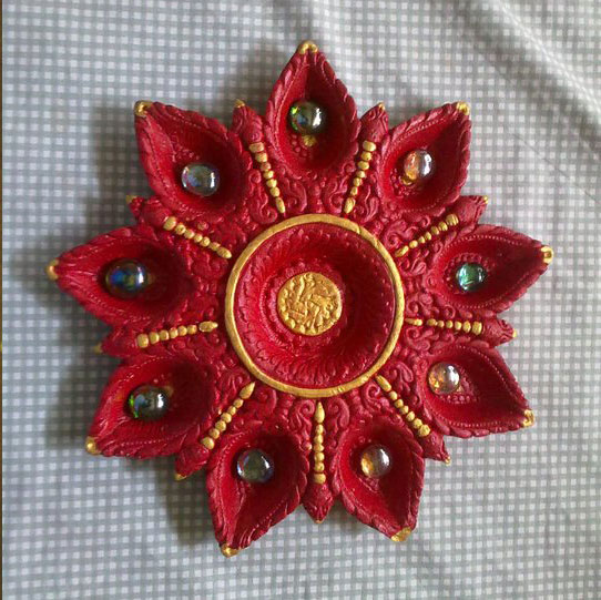 This Diwali we offer a wide range of diyas/thalis and other decorative stuff that would spark the ray of hope and celebration. This Pooja Thali is made of Clay. Avail in Red and Gold